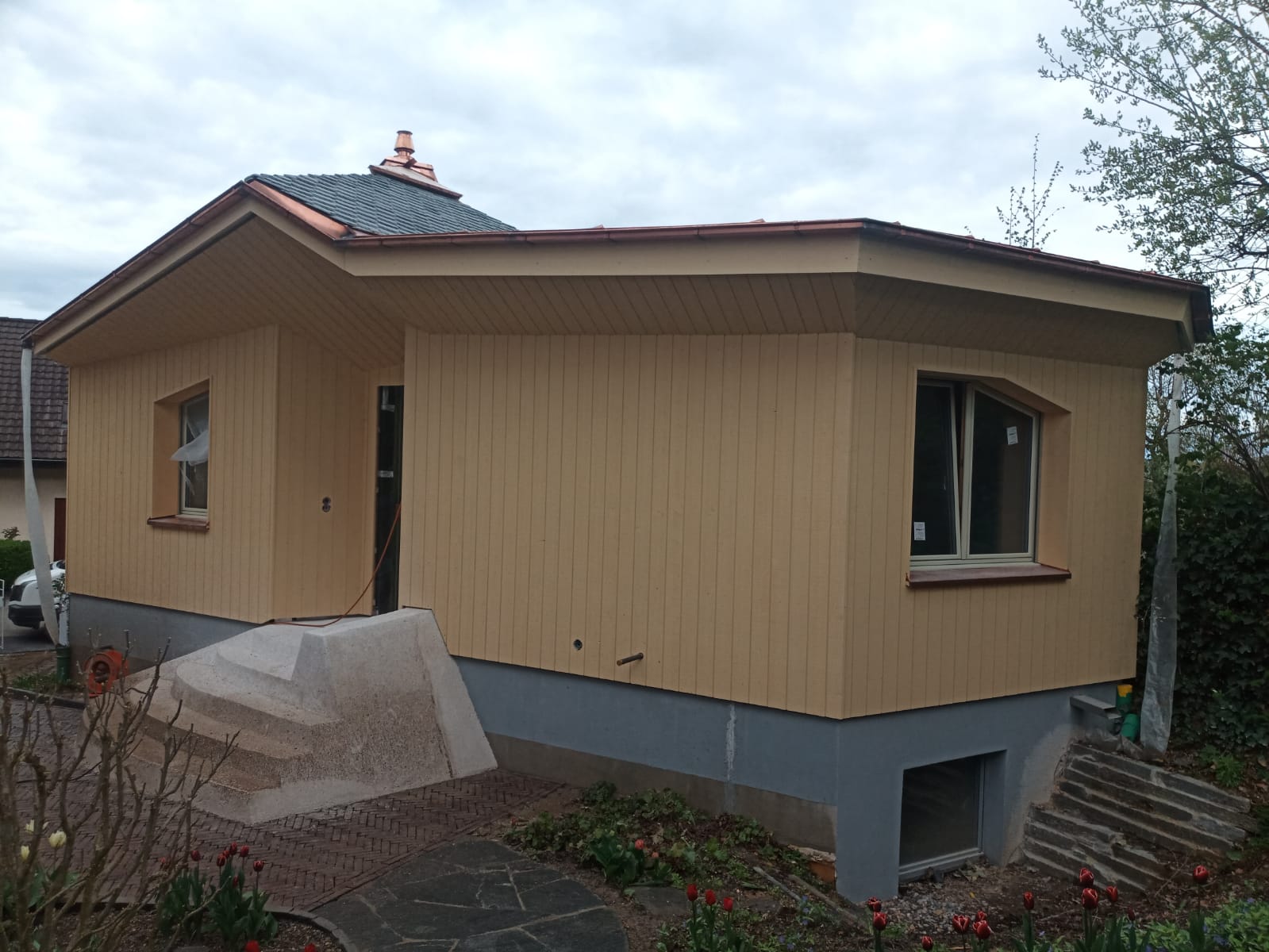 Wohnhaus in Elementbauweise mit konventionellem Dachstuhl, ökologisches Dämmsystem mit Zelluloseflocken, Steindeckung.